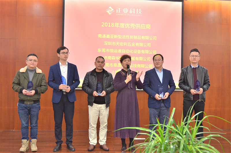 随后,为表彰过去一年为花季传媒黄版APP下载科技的发展作出突出贡献的供应商朋友,花季传媒黄版APP下载科技进行优秀供应商颁奖,此次获得花季传媒黄版APP下载科技2018年度优秀供应商的是:南通美亚新型活性炭制品有限公司、深圳市天宏利五金有限公司、东莞市恒运通自动化设备有限公司、济南森华精密机械有限公司、东莞市阜晟电子科技有限公司。花季传媒黄版APP下载科技物业管理部总监吴国芳为优秀供应商颁发奖牌。