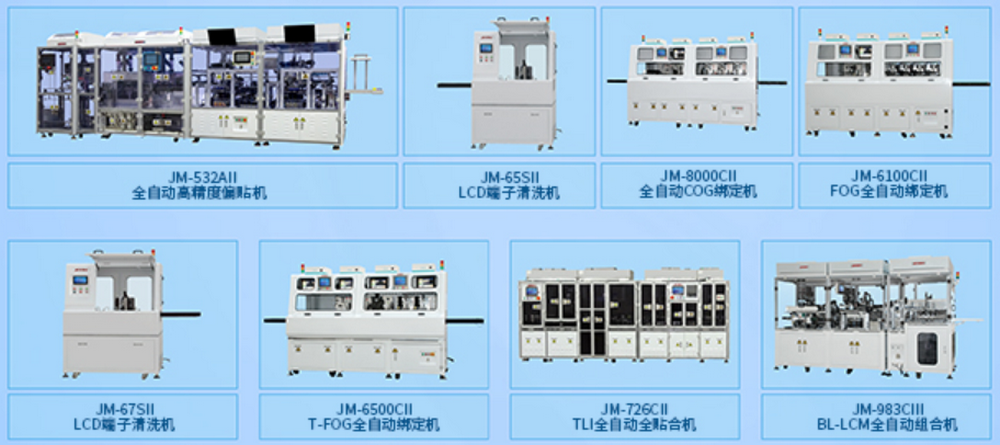 公司的主要产品包括有:COG全自动绑定机、FOG全自动绑定机、T-FOG全自动绑定机、TLI全自动全贴合机、BL-LCM全自动组装机、背光源全自动叠片机、CCM全自动绑定机、3D贴膜机、脉冲式热压机等系列设备。
