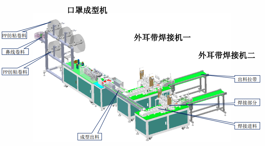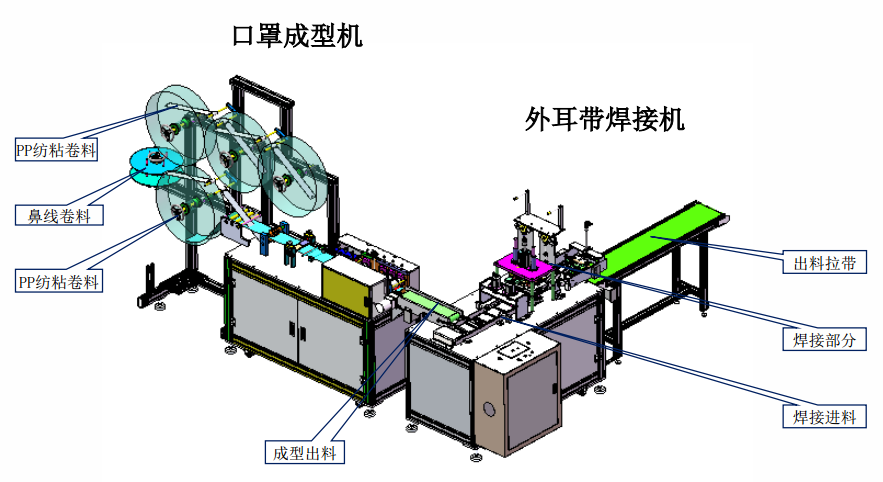 本设备主要生产平面口罩,由口罩成型机和外耳带焊接机组成。从原材料卷料自动送料、鼻线插入、截断、超声波熔合、口罩自动裁断、耳带上料及焊接等均全自动完成。