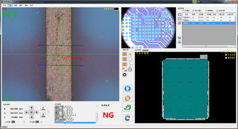 编程后量产测量速度快,平均测量≤3S/点,快速测量“线宽/线距/线宽上下幅/圆/金手指线宽等”,分析标准公差值对比,从而智能判断被测板上的测量值OK或NG。