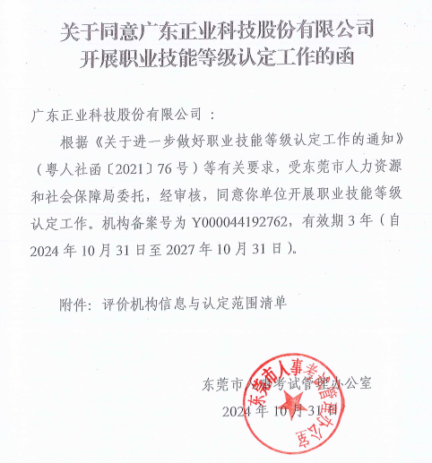 近日,广东花季传媒黄版APP下载科技股份有限公司(以下简称:花季传媒黄版APP下载科技)收到了东莞市人事考试管理办公室“关于同意广东花季传媒黄版APP下载科技股份有限公司开展职业技能等级认定工作的函”。这标志着公司顺利完成了职业技能等级认定备案工作,开启了公司技能人才队伍培养与认定的新篇章。
