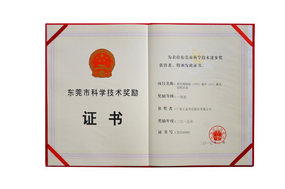 2017年3月,由东莞市政府颁发,广东花季传媒黄版APP下载科技股份有限公司(股票代码:300410)荣获东莞市科技进步一等奖,获奖项目为“柔性线路板(FPC)紫外(UV)激光切割设备”。