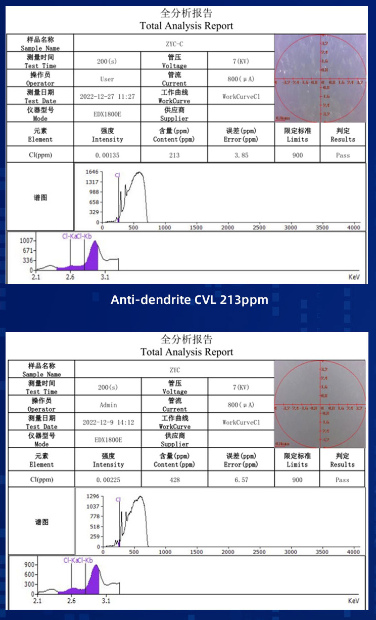 Anti-dendrite产品具有较Normal产品更低的卤素水准,更耐离子迁移。