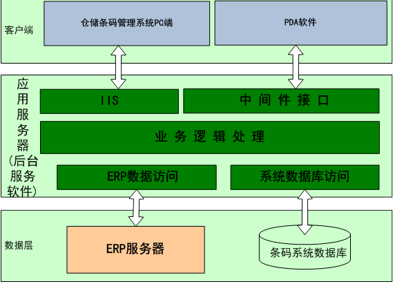 数据层为ERP服务器和条码系统服务器。